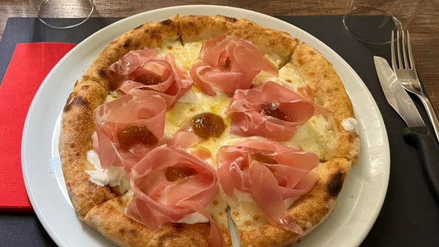 Fiordilatte, prosciutto cotto, stracciata di burrata, ciliegino e olio evo