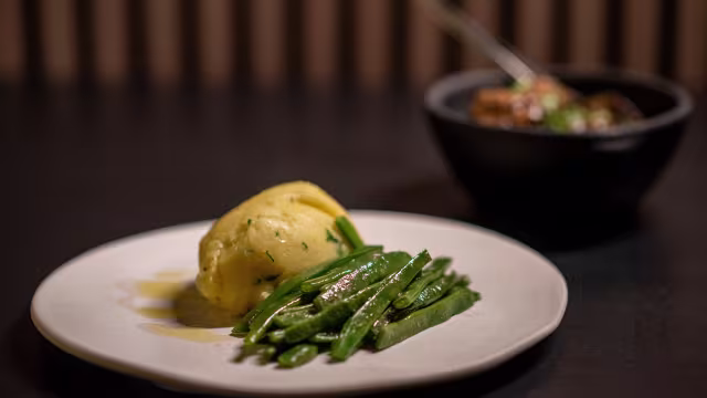 - Servido com batata esmagada na manteiga de alho e pickles caseiros