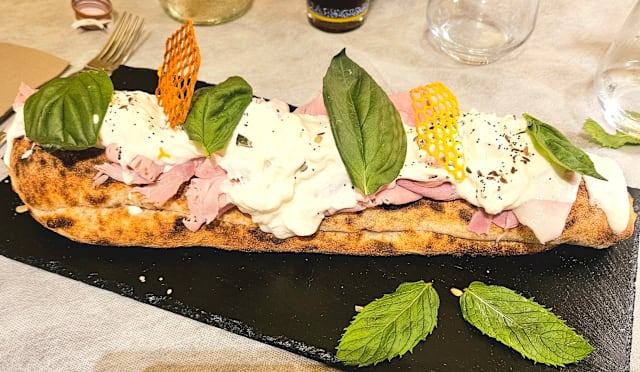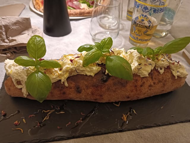 Crema di zucchine, alici, olive taggiasche, crema di pecorino, guarnita con burrata in uscita
