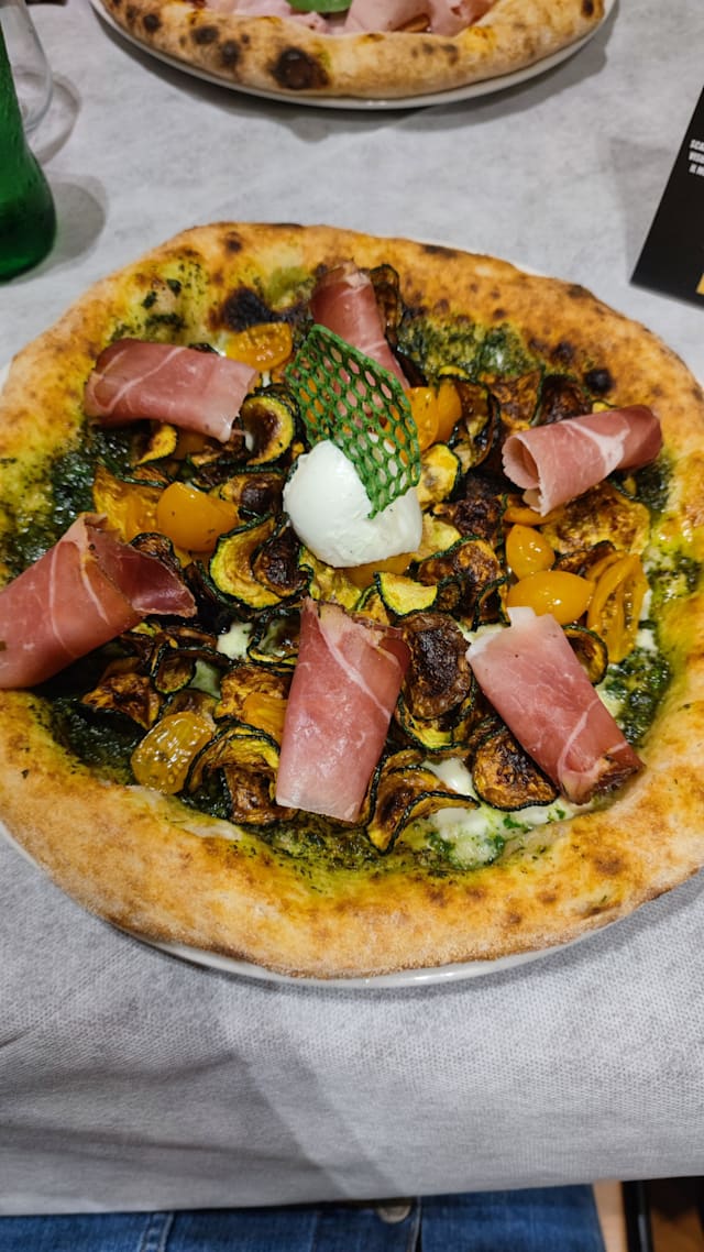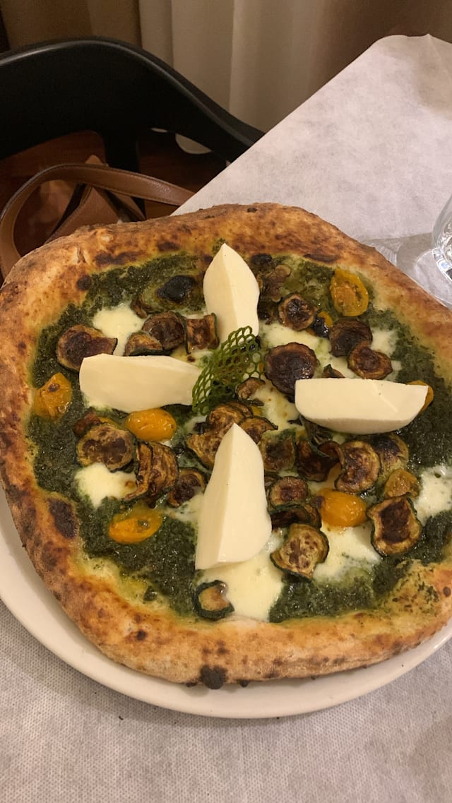 Pesto di basilico, fiordilatte, pomodorino giallo confit, chips di zucchinette, guarnita con bocconcino di fiordilatte in uscita