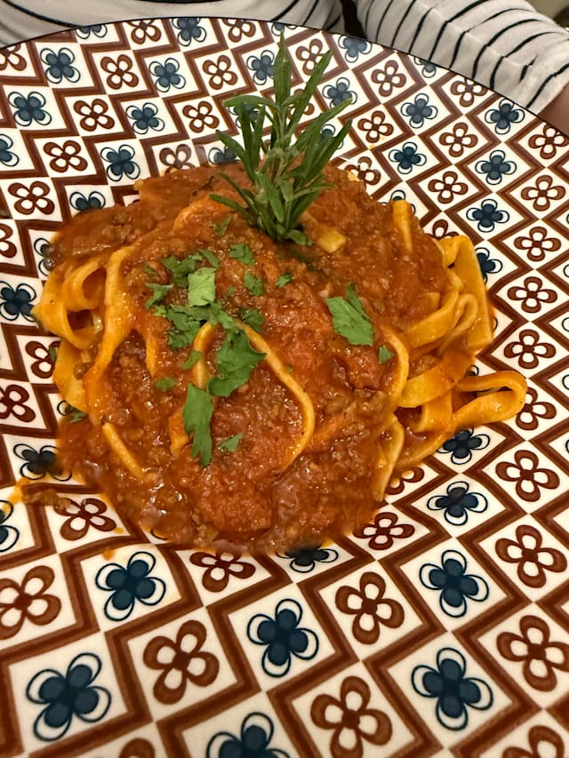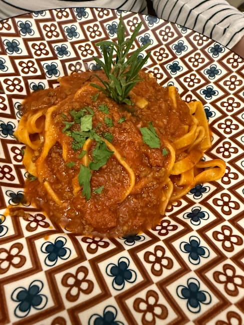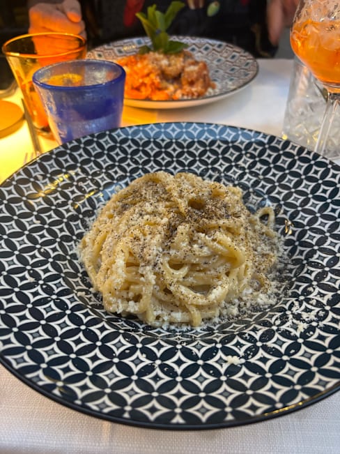 8/10Nice setting seated outside. Cace e pepa was pretty good but not too creamy. Husband said tripe was chewy. Good house red wine.
