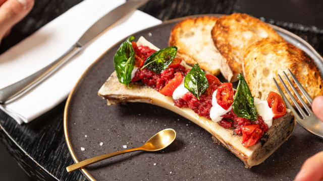 La tartare… con l’osso! Tartare di filetto di manzo crudo con stracciatella, pomodoro semi-dry e basilico fritto, servita su midollo di stinco di manzo arrostito “marrow bone”.