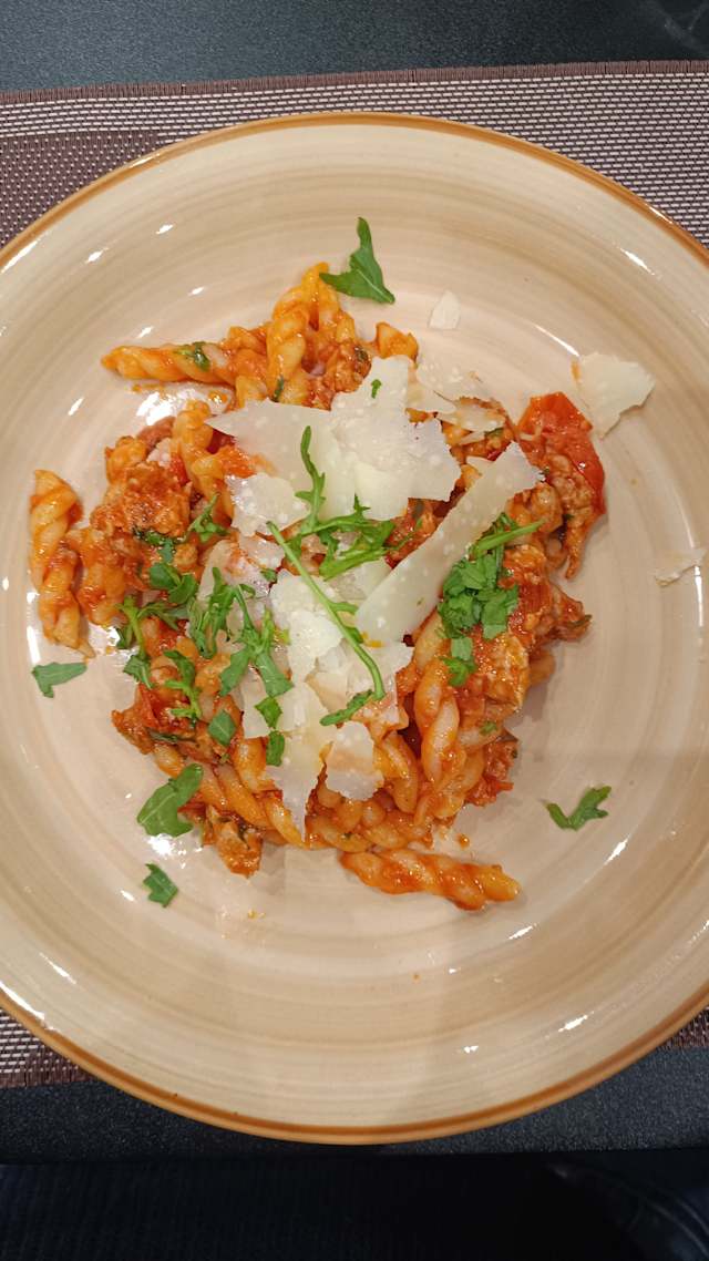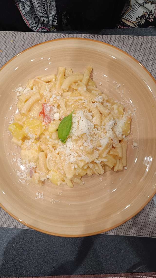 - Long fusillo of fresh pasta, aubergines, tomato and provola
