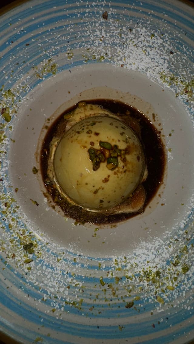 tiramisù con semisfera di cioccolato bianco, Nutella e mascarpone al pistacchio su cui viene versato un caffè espresso (anche in versione senza glutine)