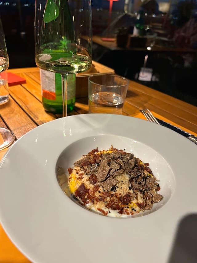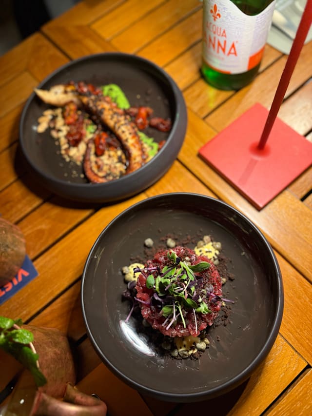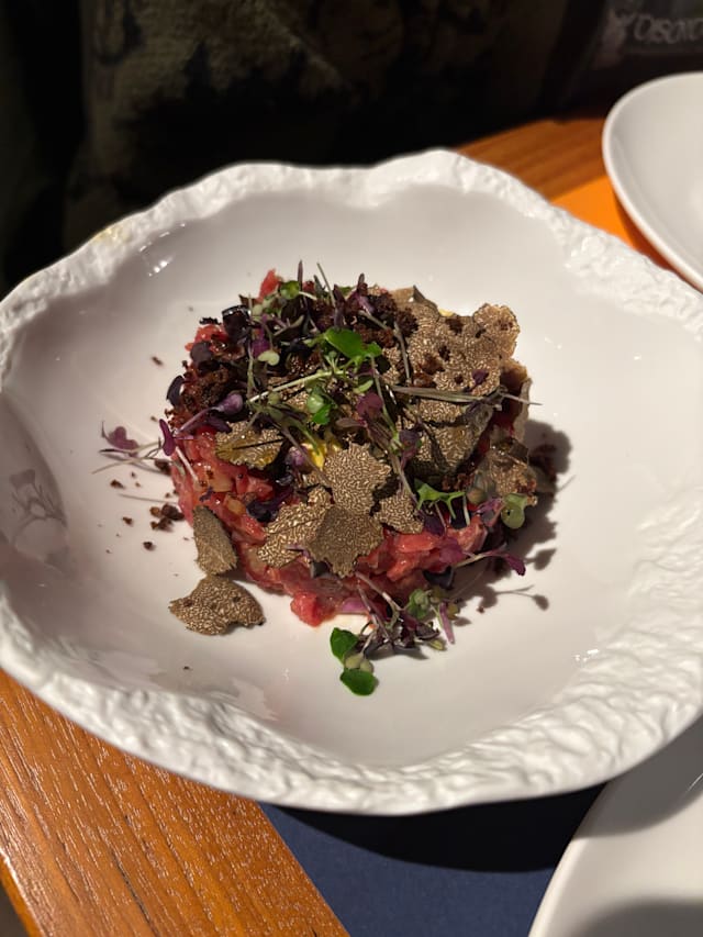 3.5/10The food was subpar, and the service was even worse. We had the beef tartar, Parma pizza, and wine. The pizza arrived cold. When we told the waiter, he said they'd make a new one, but instead they just reheated our semi-sliced tray (with a few slices missing). It would have been reasonable if it were warm at that point, but it was at the same temperature that it was when it was sent back. The waiter asked if everything was OK so we mentioned it to him. He offered dessert, but after staying quite a while we realized it wasn't a sincere offer. They don't really seem to care if you had a good experience as long as you paid for the overpriced meal.