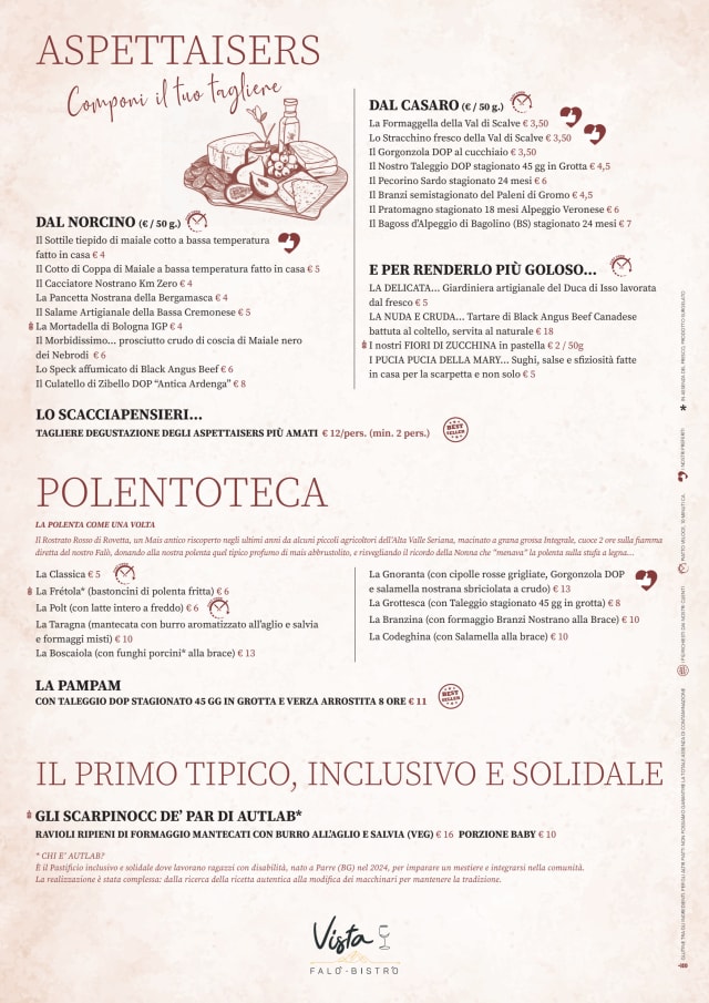 Il Vista Falò Bistró offre una cucina che fa della genuinità e della semplicità i suoi fiori all’occhiello. Non siamo capaci di inventare nulla, lo show cooking lo lasciamo fare ad altri…qui si compra roba molto buona e si prova a non rovinarla, prima di metterla nel piatto: fortunatamente spesso ci...