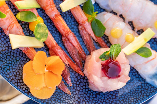 2 Gamberi rossi siciliani di mazzara del vallo serviti crudi con caviale asetra e composta di agrumi