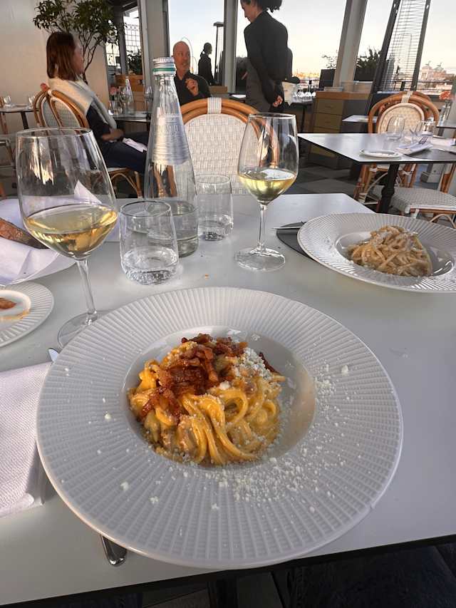 8/10A beautiful restaurant with great views of Rome and good quality food. The homemade Parmesan biscuits (that are served with the bread are delicious). Highly recommend the Carbonara and Cacio Pepe pastas.
