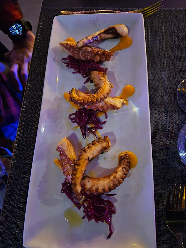 - polpo croccante su crema di carote all'arancia e cavolo viola marinato al timo