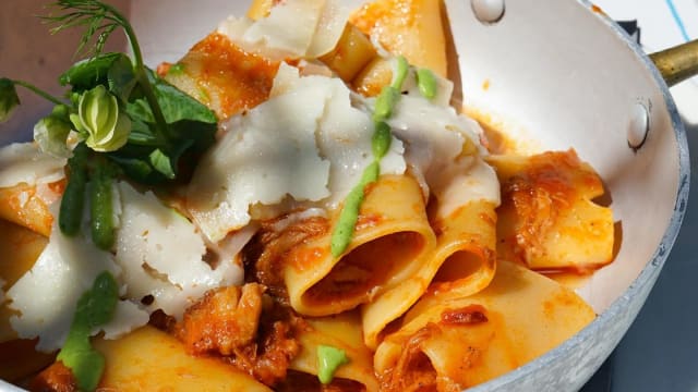I mezzi paccheri con pomodorino pachino, stracciatella e basilico