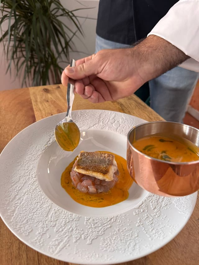 - Lagosta fresca, xerém, bivalves, pimento, tomilho limão