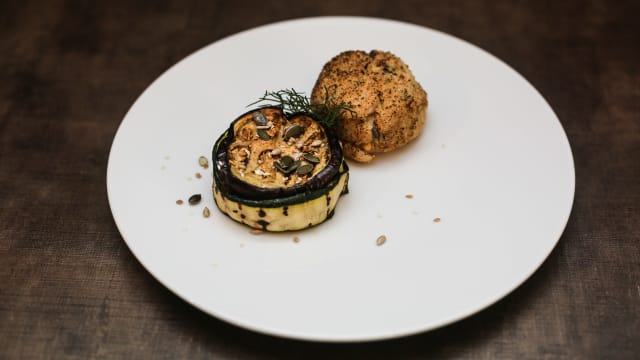 - Arancino “acquarello” q con sugo di vitello su crema di piselli secchi