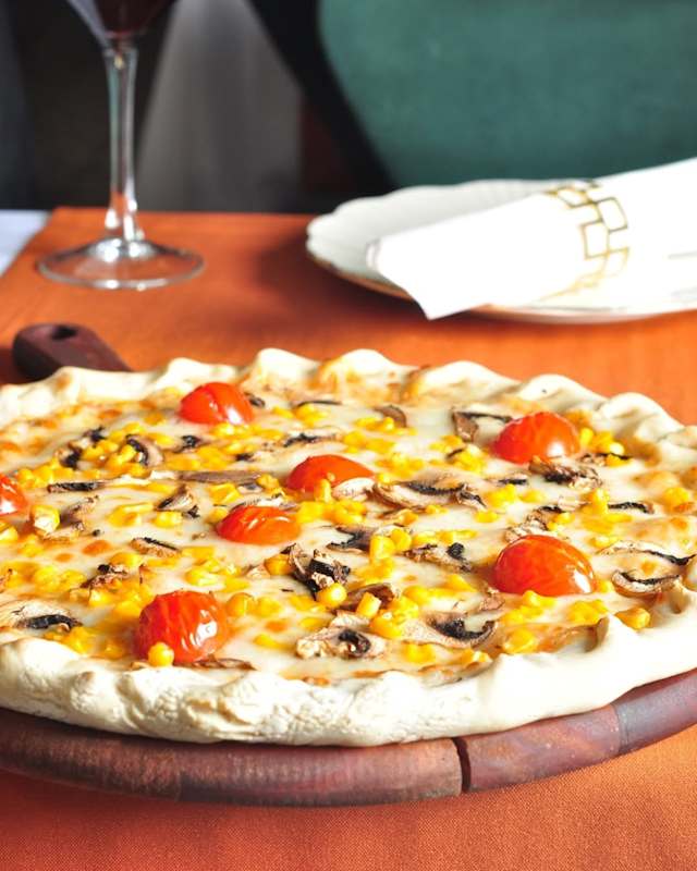 - Molho de tomate, queijo mozzarella, cogumelos, milho e tomate cereja