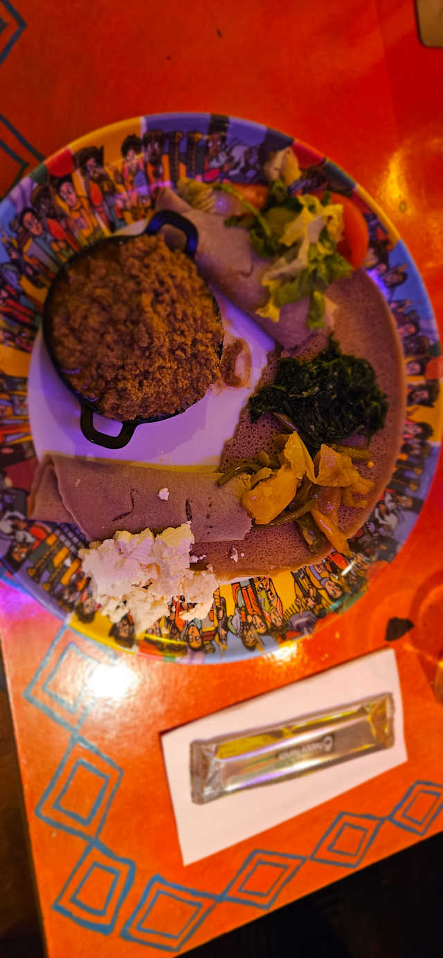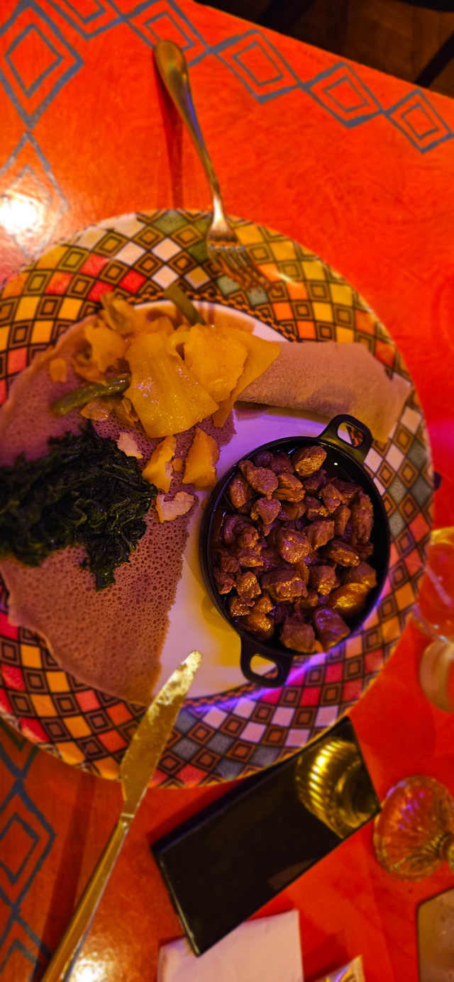 Blokjes mager rundvlees gebakken in geklaarde kruidenboter geflameerd met wihskey, geserveerd met enjera, spinazie, linzen en groetenmix.