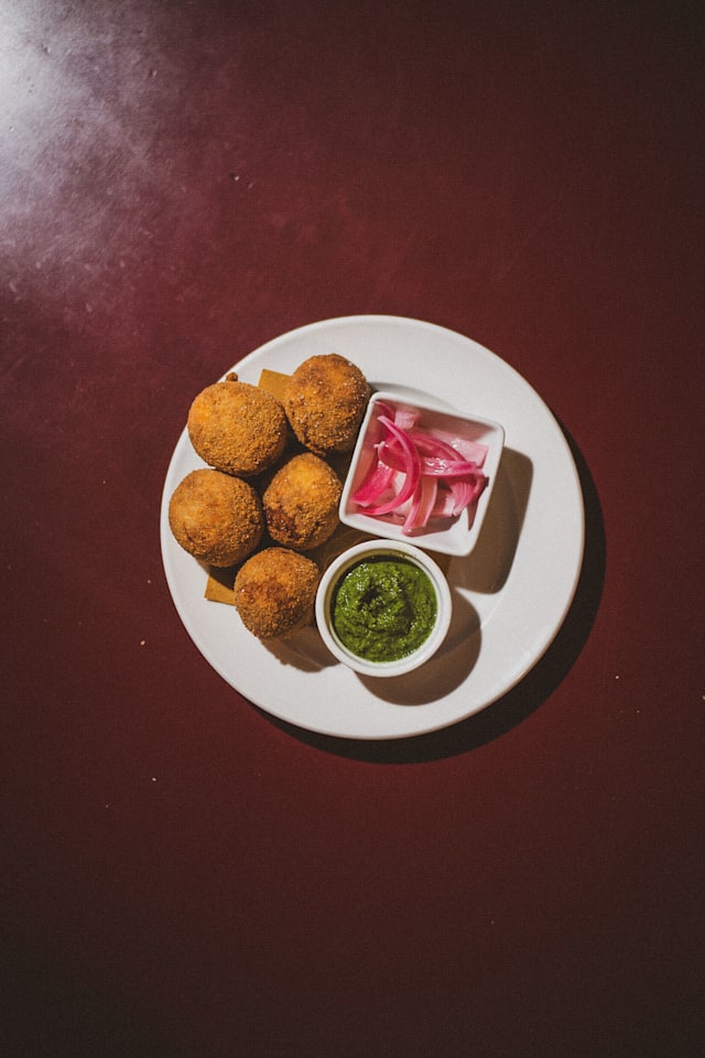 Crocchette fritte di bollito, petali cipolla in agrodolce e salsa verde