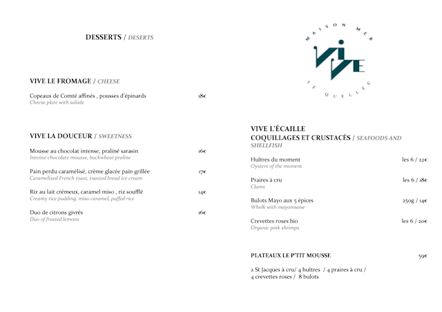 10/10We had an unforgettable evening. As it was our first time at chez Vive Maison Mer, we were very well guided in terms of the menu and the wine. The food was excellent! The service was absolutely outstanding. For us a very nice experience and we will come back for sure.