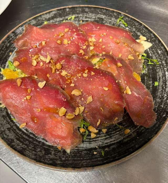 - Carpaccio di manzo marinato agli agrumi con insalata invernale