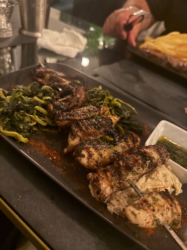 Polpo alla griglia hummus di ceci verdure grigliate salsa al peperone arrostito