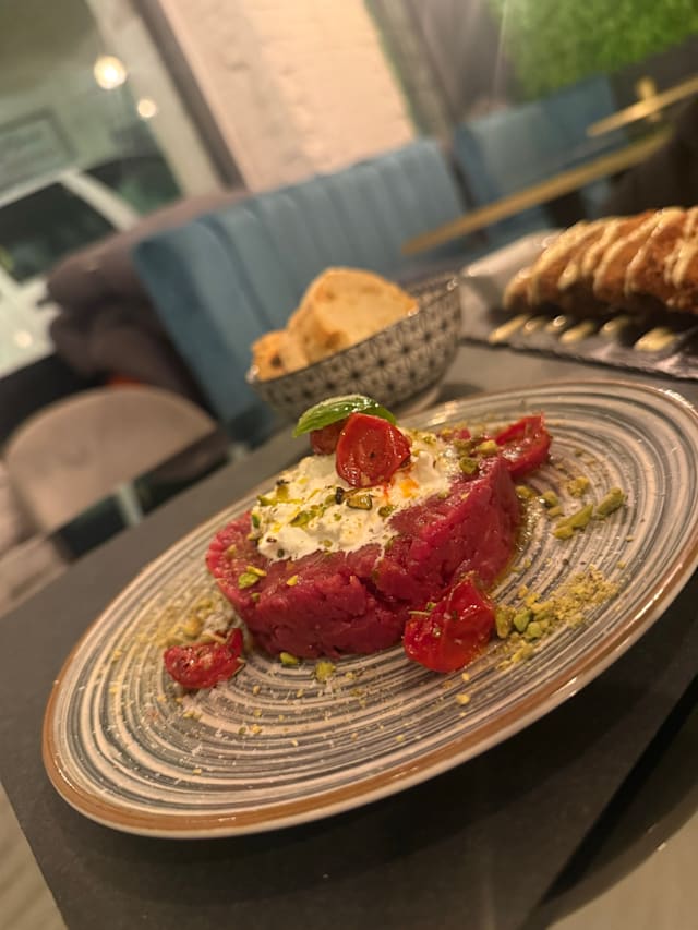 Tartare di filetto di manzo pesto di pomodorini olive taggiasche stracciatella di bufala e granella di pistacchi
