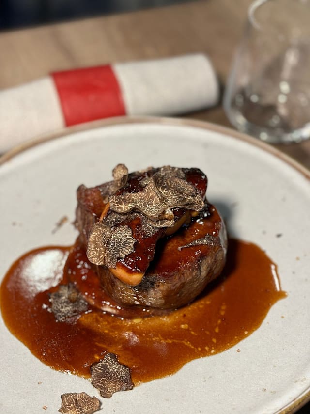 - 80g di tenerissima carne di Black Angus condita con nocciola e spuma di pompelmo