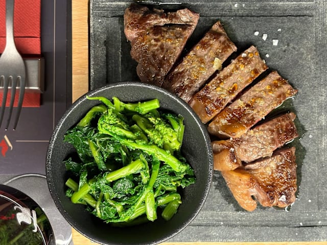 - Deliziosa tagliata di black angus da 300g, dal gusto deciso, condita con olio e fiocchi di sale. Con contorno a scelta