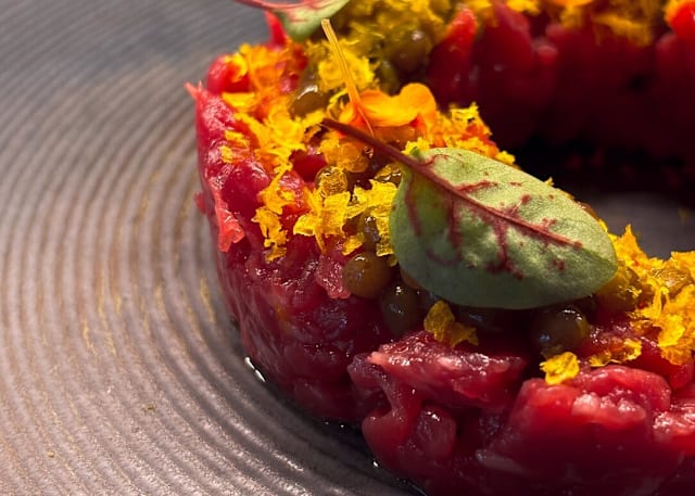 Tartare di chianina da 80g circa con crema di bufala, olive taggiasche e arancia candita