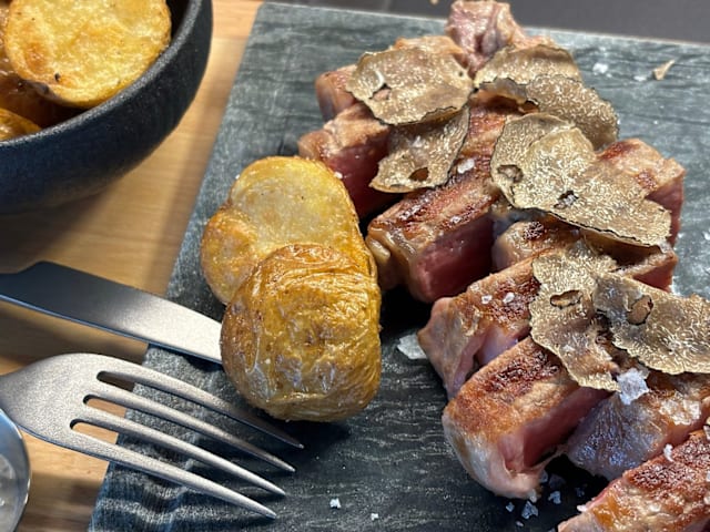 Tenero e gustoso filetto da 300g circa, condito con foie gras e tartufo fresco adagiato su pan brioche