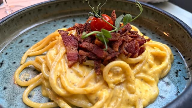 Tuorlo, pecorino, pepe nero, guanciale di norcia al pepe.