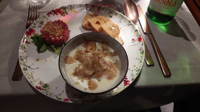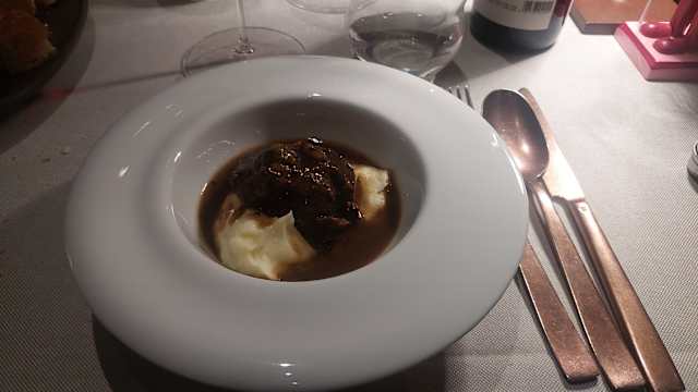 - Tagliata di fassona, suo fondo, crema di patate, tartufo nero