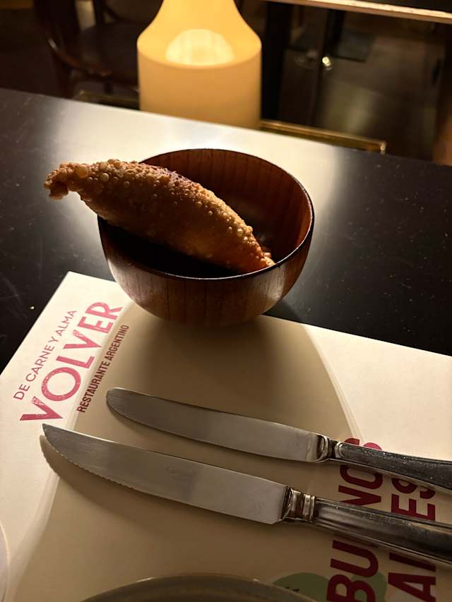 - 'Chorizo' argentino (vaca e porco), cebola roxa, queijo azeitão, chimichurri, mel