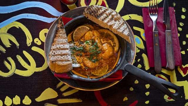 Red prawns in chili oil, served with garlic bread, and coriander or parsley. Note: if you don’t choose, coriander will be used