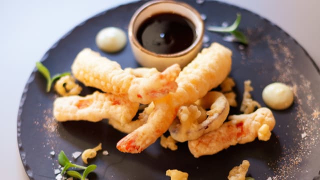 In crosta di panko al nero di seppia, salicornia, maionese al wasabi e salsa teriyaki