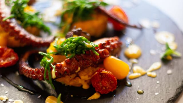 Bun al nero di seppia, polpo piastrato, crema di zucchine scapece, pomodori secchi e stracciatella di burrata, servito con chips di patate a parte