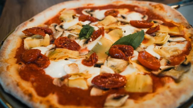 Sauce tomate, fiordilatte di agerola, jambon cuit, œufs, artichauts, champignons et basilic