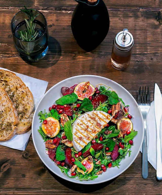 - Mixed salad, arugula, grilled manouri cheese, plums, figs, pomegranate, roasted pecans, mint, honey, olive oil, black pepper, salt