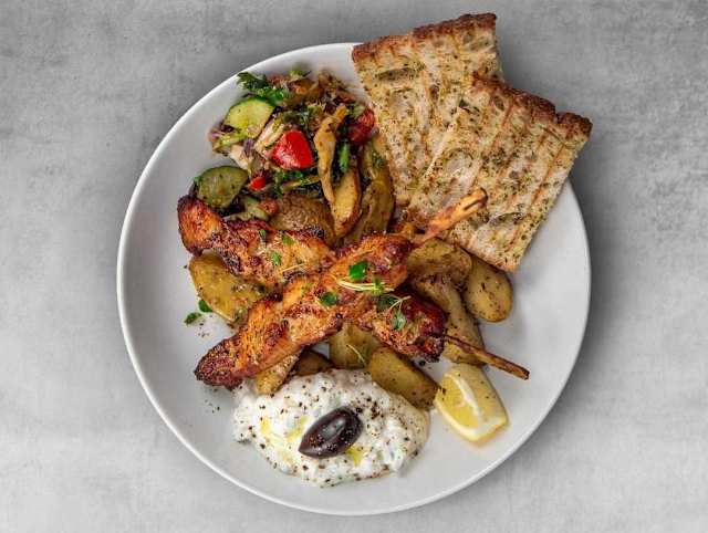 - Chicken gyros, oven-baked lemon potatoes, salad, cucumber, semi-dried tomatoes, kalamon olives, red onion, feta cheese, tzatziki, lemon wedge, ladolemono dressing
