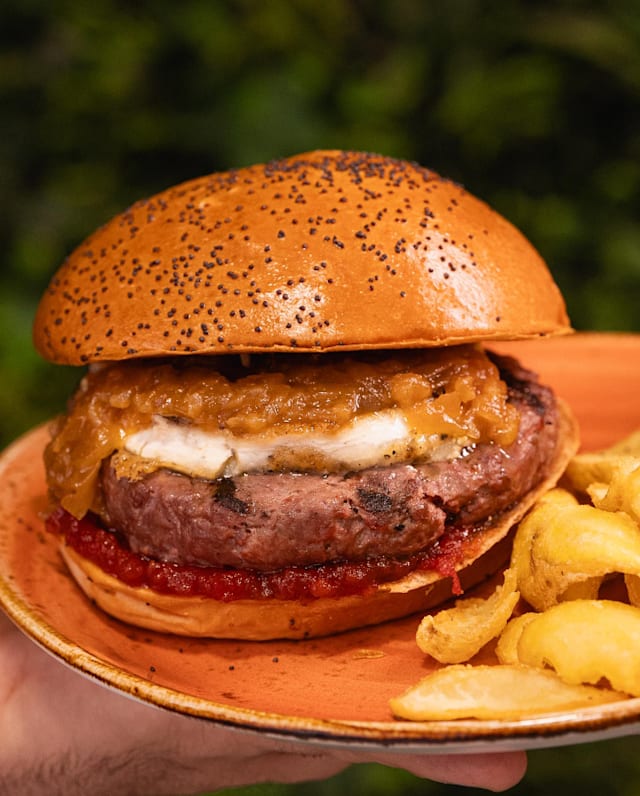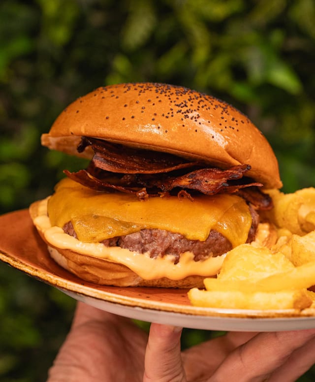 - Doble de queso cheddar americano, mermelada de bacon casera con cebolla caramelizada, mahonesa de bacon ahumado, polvo de bacon y jeringuillazo de salsa smoked