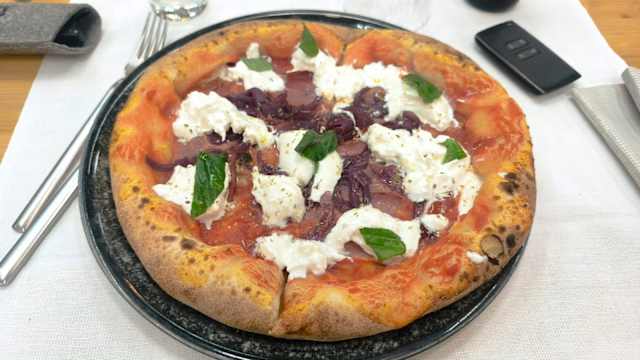 - Pomodoro pelato pugliese, petali di fiordilatte fresco, porchetta i.g.p., ‘nduja calabrese, pesto di basilico, burrata pugliese, olio e.v.o