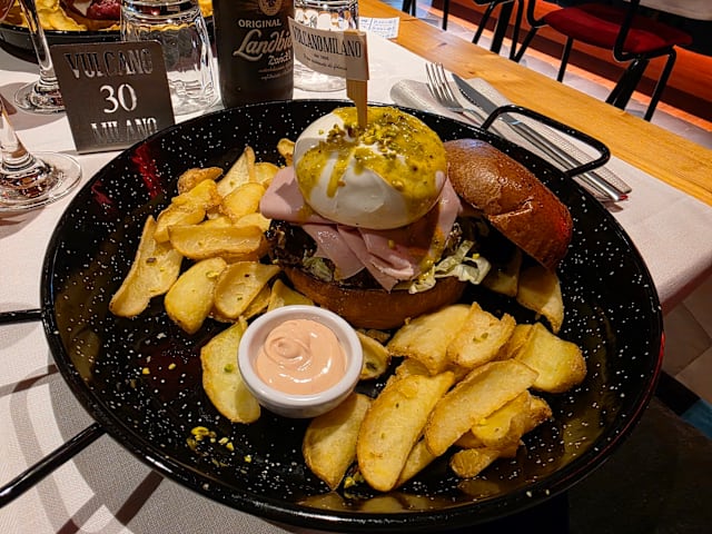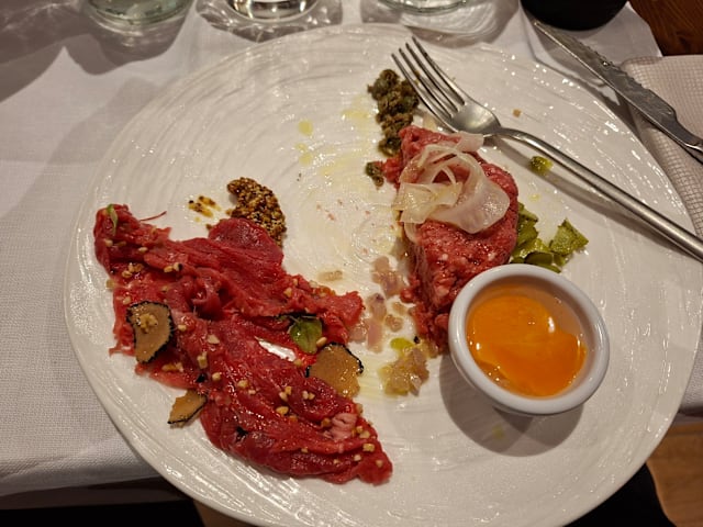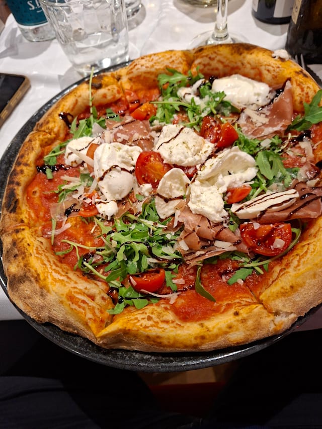 9.5/10+1Our experience at the restaurant exceeded expectations. Service was generally good, though one waiter occasionally forgot items we ordered. The food was fantastic, with a varied wine selection that suits any taste. The pizzas were particularly memorable; I highly recommend the one with wild boar mortadella and smoked burrata—a unique and flavorful choice. The burrata with ragu and ravioli starters were also excellent. Although the beef main course was a bit disappointing, the restaurant was happy to add extra truffle slices upon request. Conveniently located near the exhibition grounds, the restaurant also has a parking area right in front, making it easily accessible. Overall, it’s a great spot with delicious food and a comfortable ambiance.