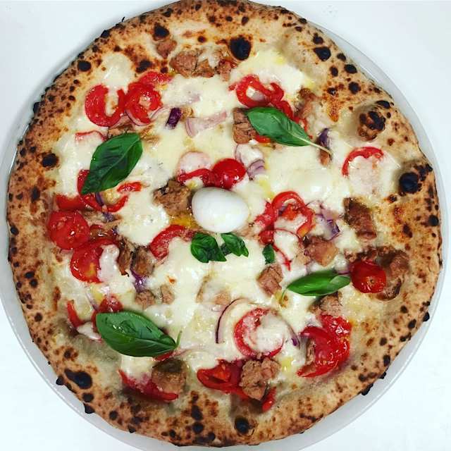 - Mozzarella, pomodorini, tonno e cipolla rossa