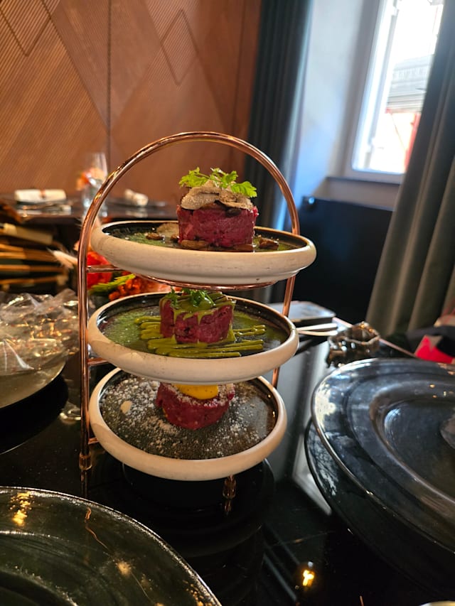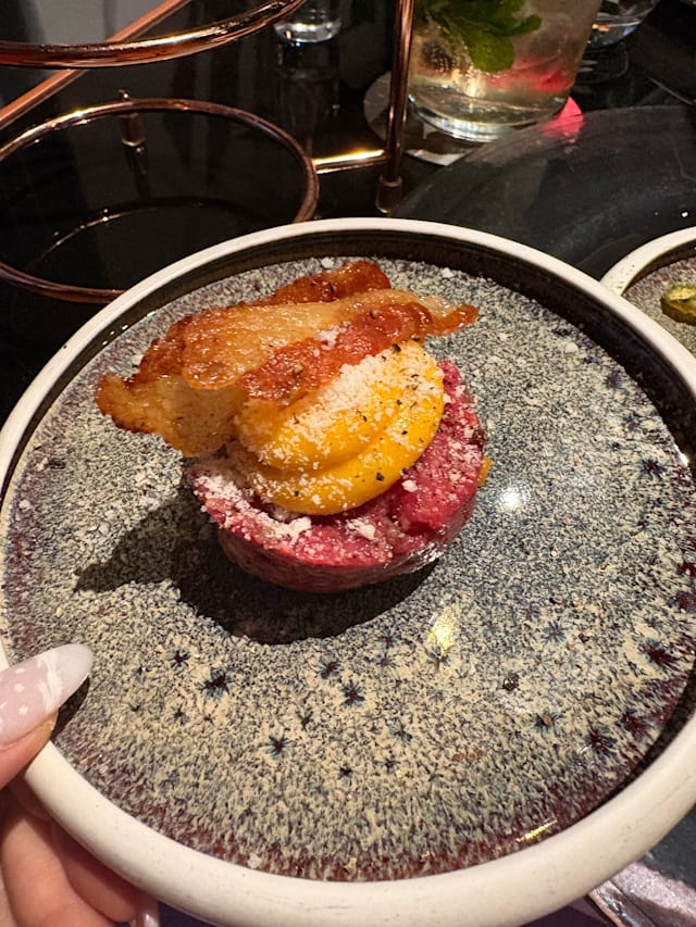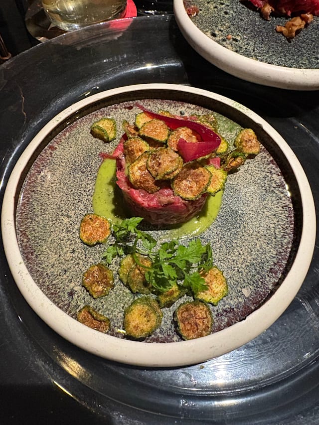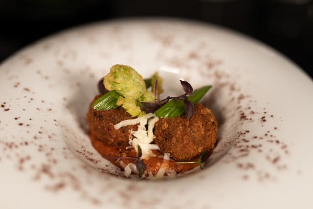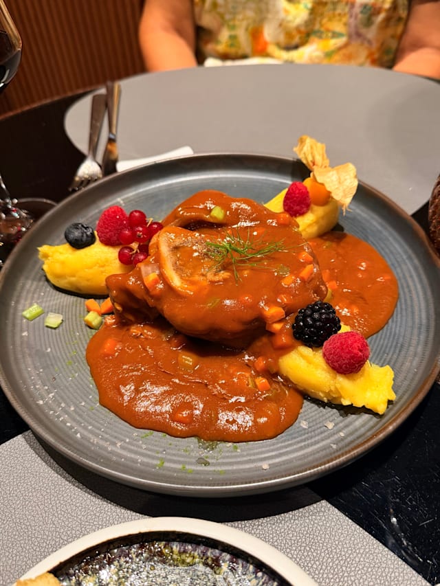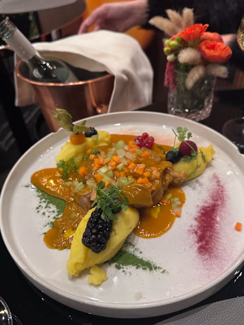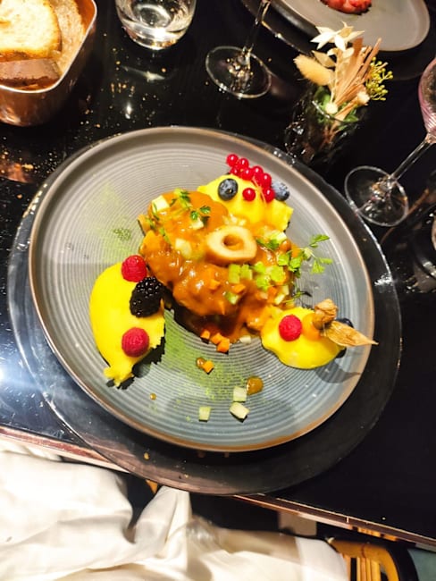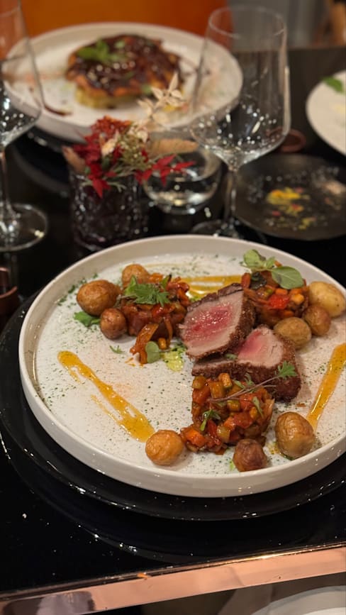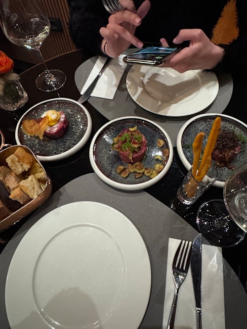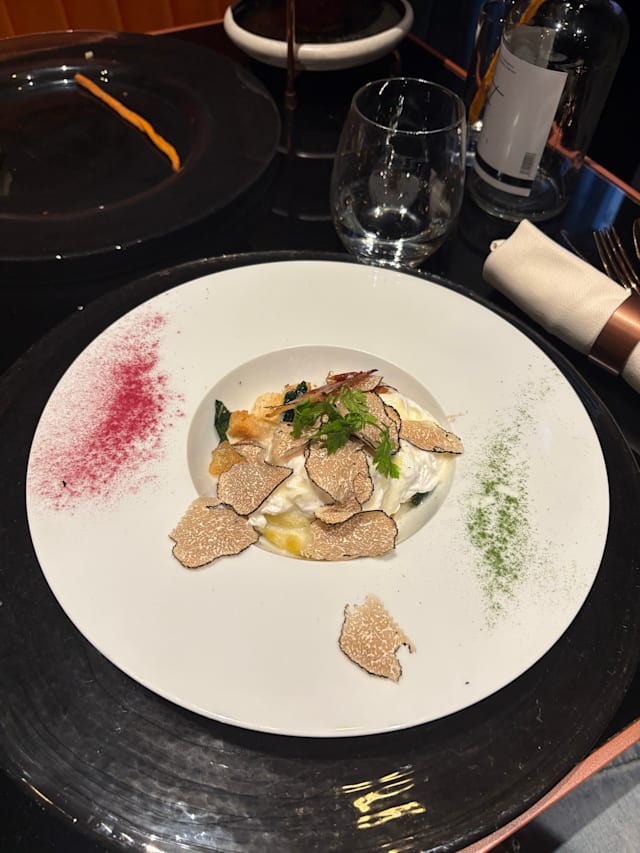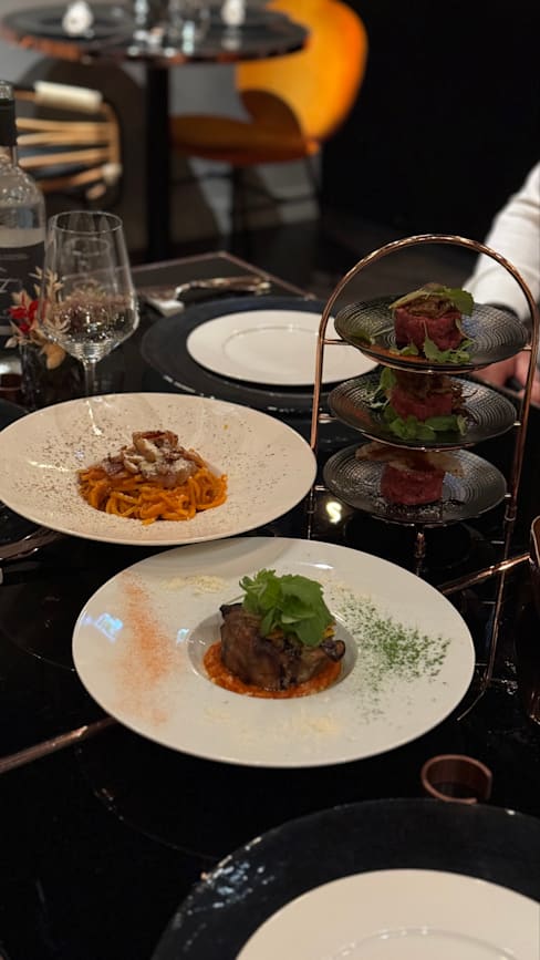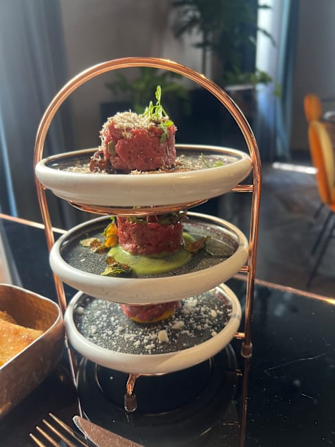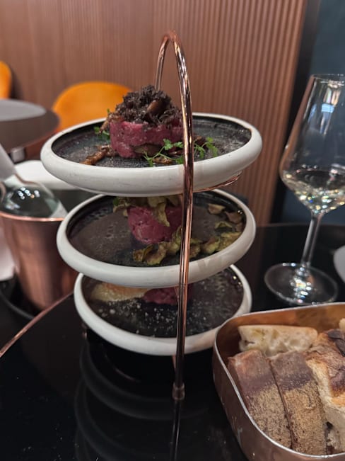 8/10The restaurant’s stunning and modern decor immediately impressed me upon arrival. However, my initial excitement was dampened by the loud music and crumbs scattered on the stairs as we were escorted to our table. Service was prompt, and I appreciated that the menu clearly marked allergens, allowing us to make an informed choice. That being said, I always double-check menus beforehand, and with the staff and it turned out there was an error regarding gluten-free options. I was served gluten-free bread, which I enjoyed alongside my meal. The wine selection was excellent, and the food itself was good, but attention to detail needs improvement. Cleanliness, in particular, was a letdown—especially the state of the toilets, which were a mess. A place this visually impressive should ensure that every aspect of the dining experience matches its aesthetics.