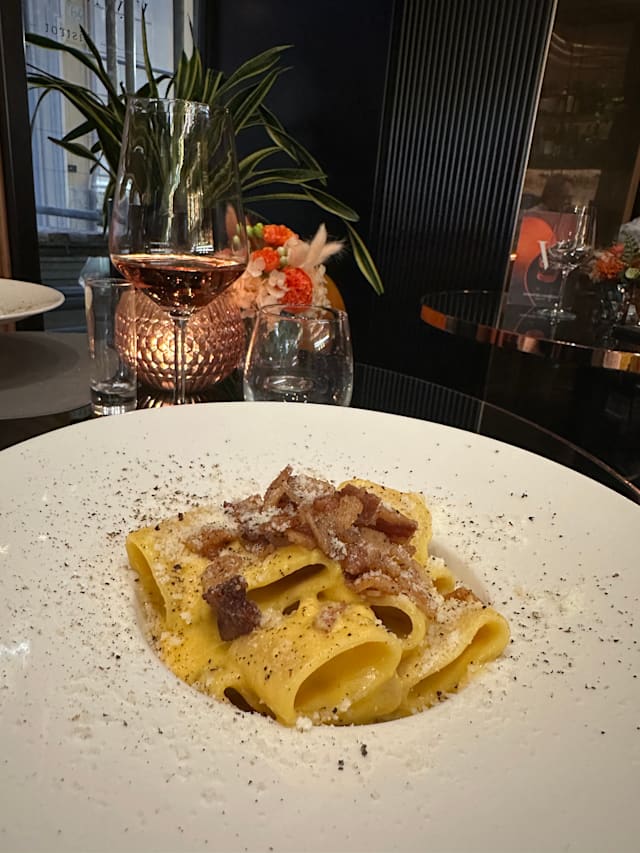 8.5/10We had a nice relaxing meal outside take while enjoying people watching in Rome. The whipped cod appetizer was excellent and creative in is use of puttanesca sauce. I had the carbonara for my main while my wife had the grecia. Both were served with shaped pasta instead of noodles and you'll get no complaints from us on that choice, as they were perfectly al dente. The sauces for both dishes were both delicious and clung well to the noodles. The only miss for us was the sauteed chicory with red garlic. Overall a great experience and would dinner there again. Worth noting that is you use the Fork app you can make a reservation ahead of time and perhaps get a discount as well.