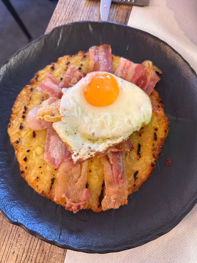 - Schiacciata rösti con uovo all'occhio di bue e bacon croccante