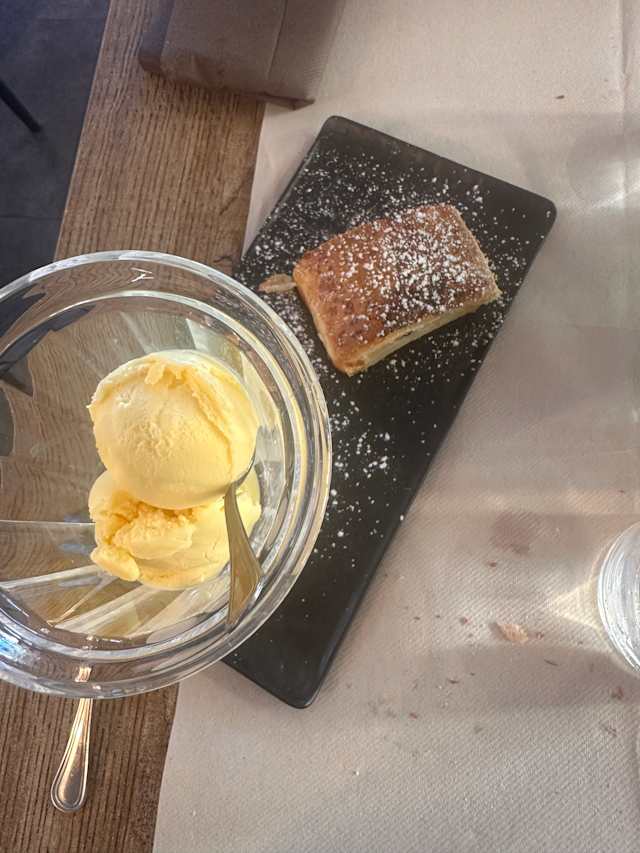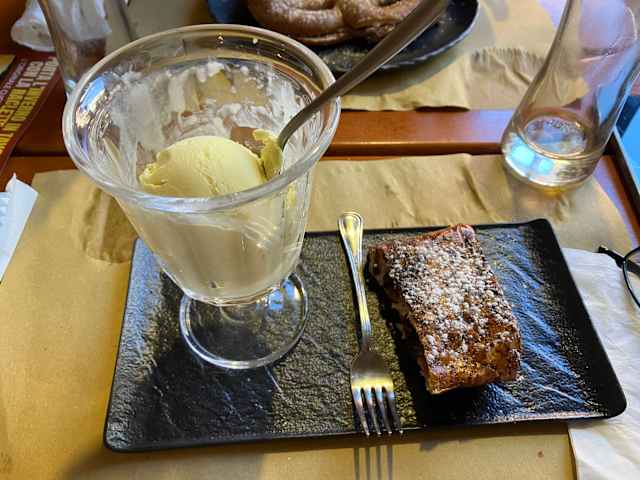 - Strudel di mele servito con gelato alla crema, panna e cioccolato