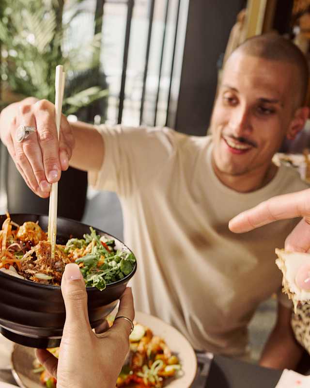 - Noodles di riso cotti in salsa amai* con uovo, germogli, porri, chilli e cipolla rossa + cipollotto. Conditi con scalogno fritto, menta, coriandolo + uno spicchio di lime fresco