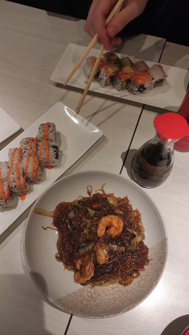 - Gamberi, uova, piselli, carote, germogli di soia, verza