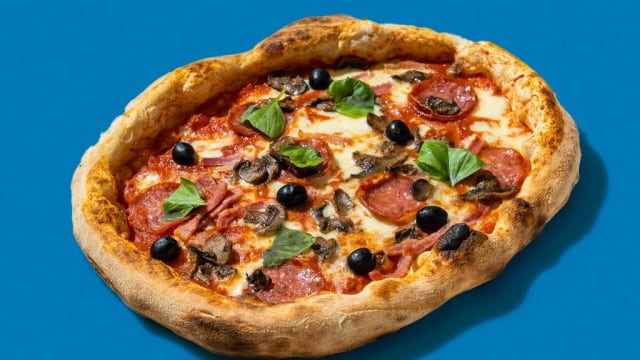 Pomodoro san marzano dop, fior di latte campano, prosciutto cotto, salame napoletano, olive nere, funghi champignons e all'uscita: olio evo campano