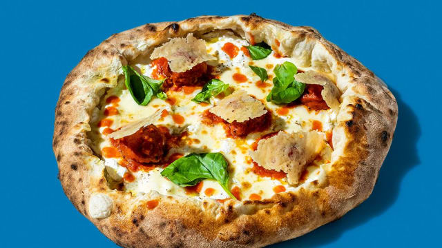 Fior di latte campano, crema di pomodorino giallo, spianata piccante calabrese, scaglie di pecorino romano