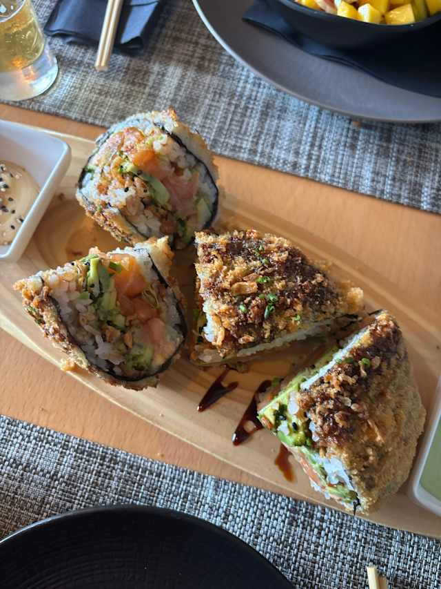 Nori, arroz, salmão, queijo creme, manga e ovas de peixe
