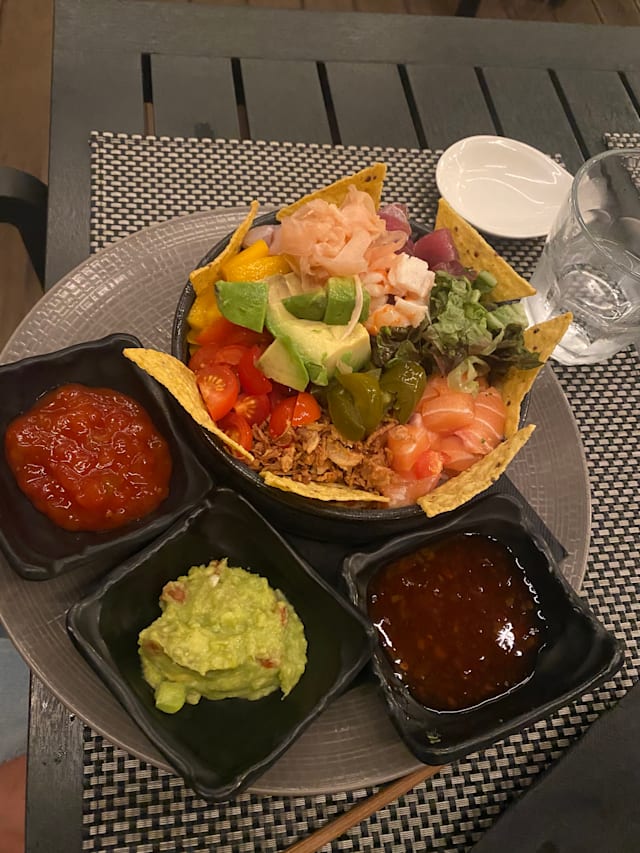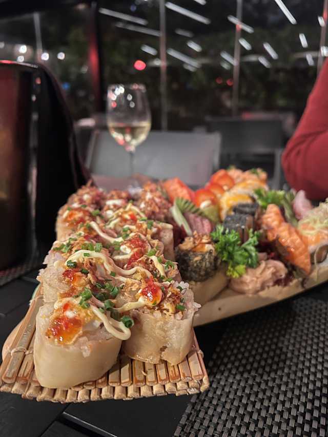 Salmão, atum e peixe branco, alho francês, cebolinho, molho pesto e molho ponzu.
